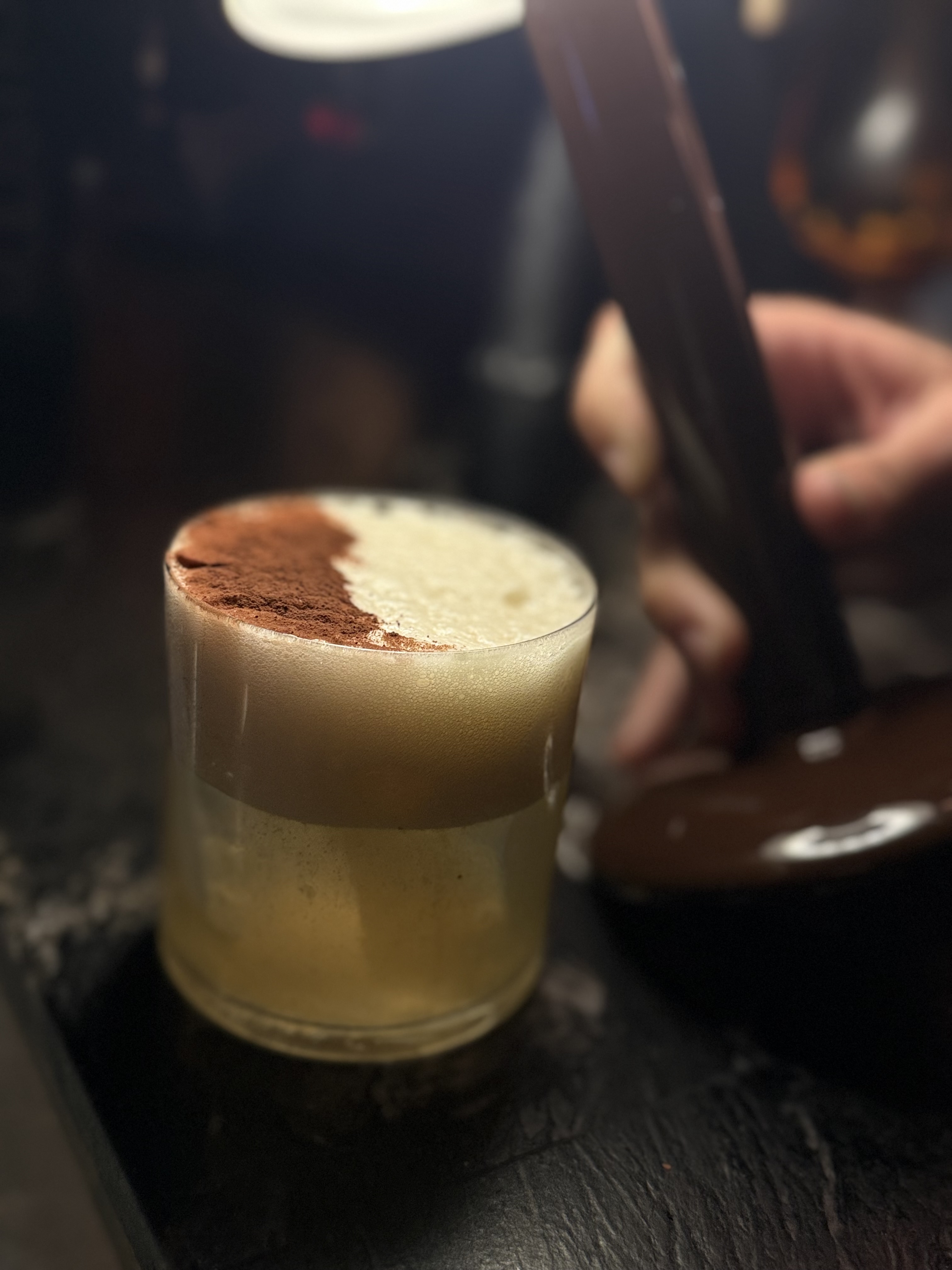 Luego decoramos con la espuma de miel de romero y espolvoreamos el cacao , al final tendrás un cóctel digestivo que te recordará al chocolate de dulce de leche, pero al beber todo junto conseguirás tener un sabor más redondo