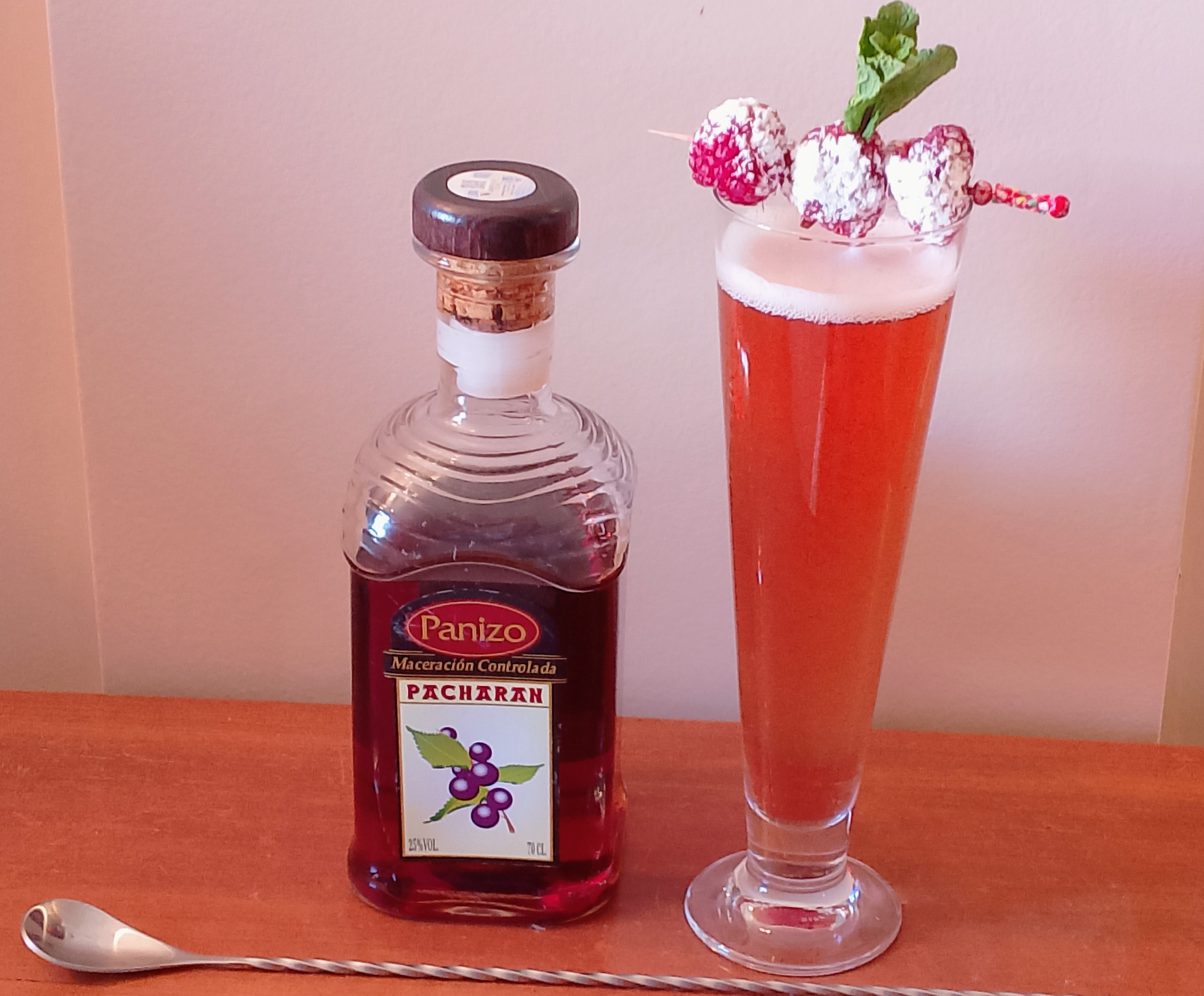 Comenzaremos añadiendo y majando las frambuesas en una coctelera, para después incorporar el Pacharán y el Grand Marnier y agitar todo en su conjunto.