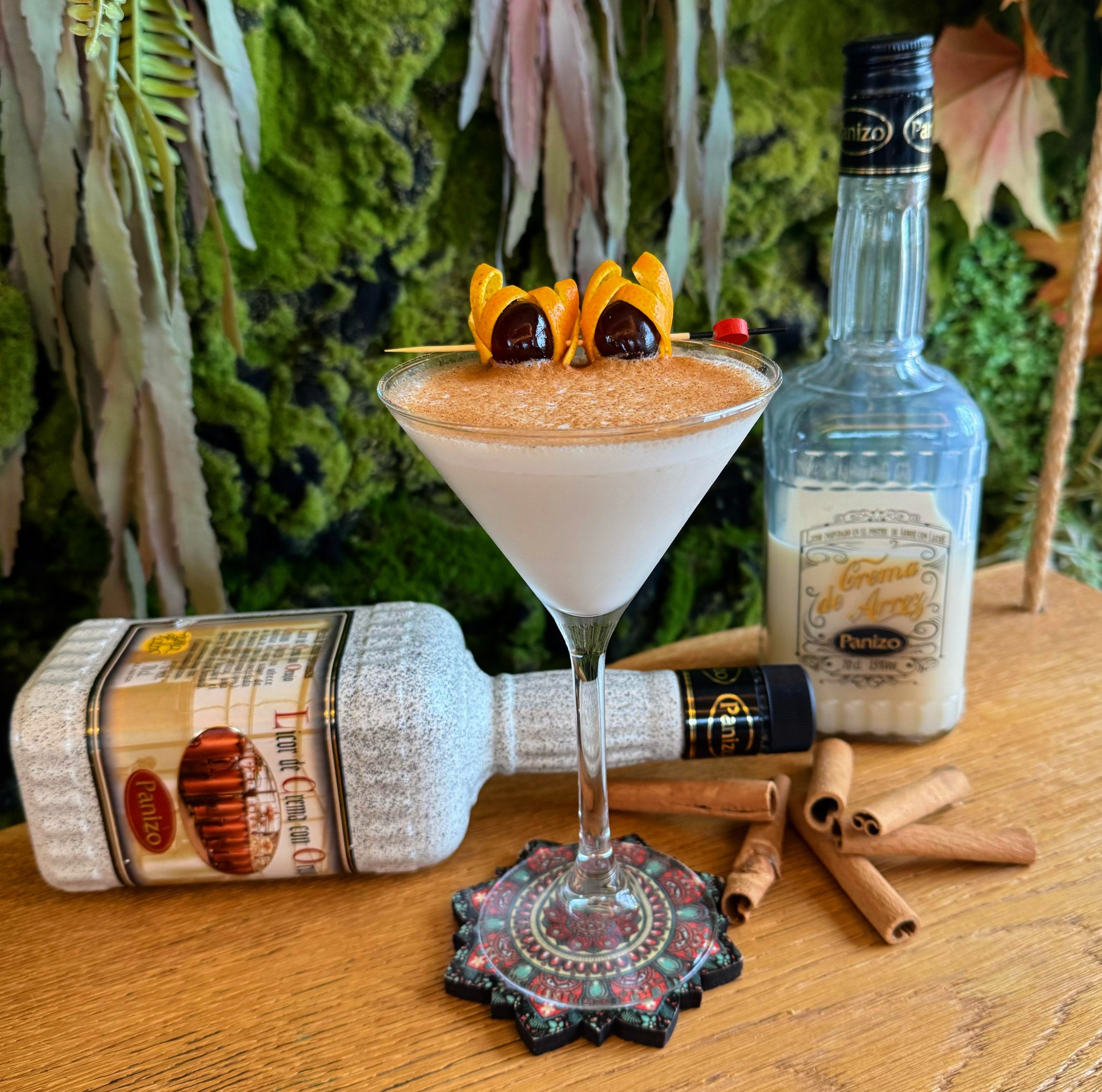 Vertemos el líquido en una copa Martini y espolvoreamos canela en polvo por encima. Acabamos decorando con una brocheta de pieles de naranja y amarenas.