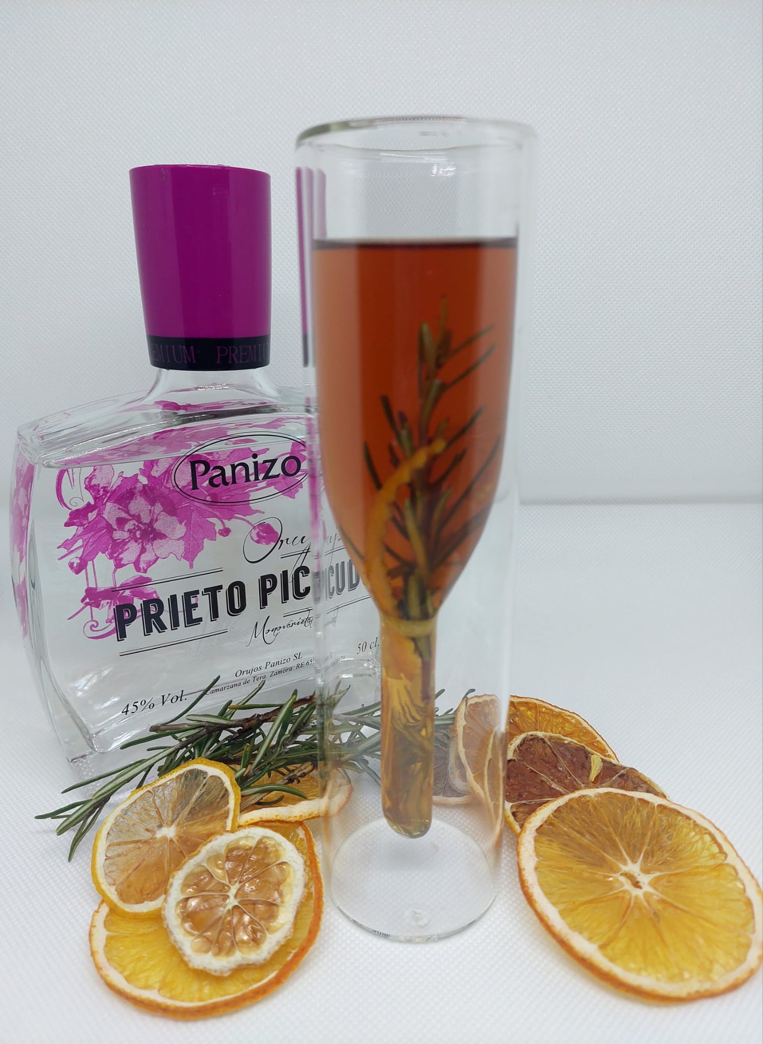 Decorar con un ramillete de romero, naranja y limón que introduciremos dentro de la copa.
