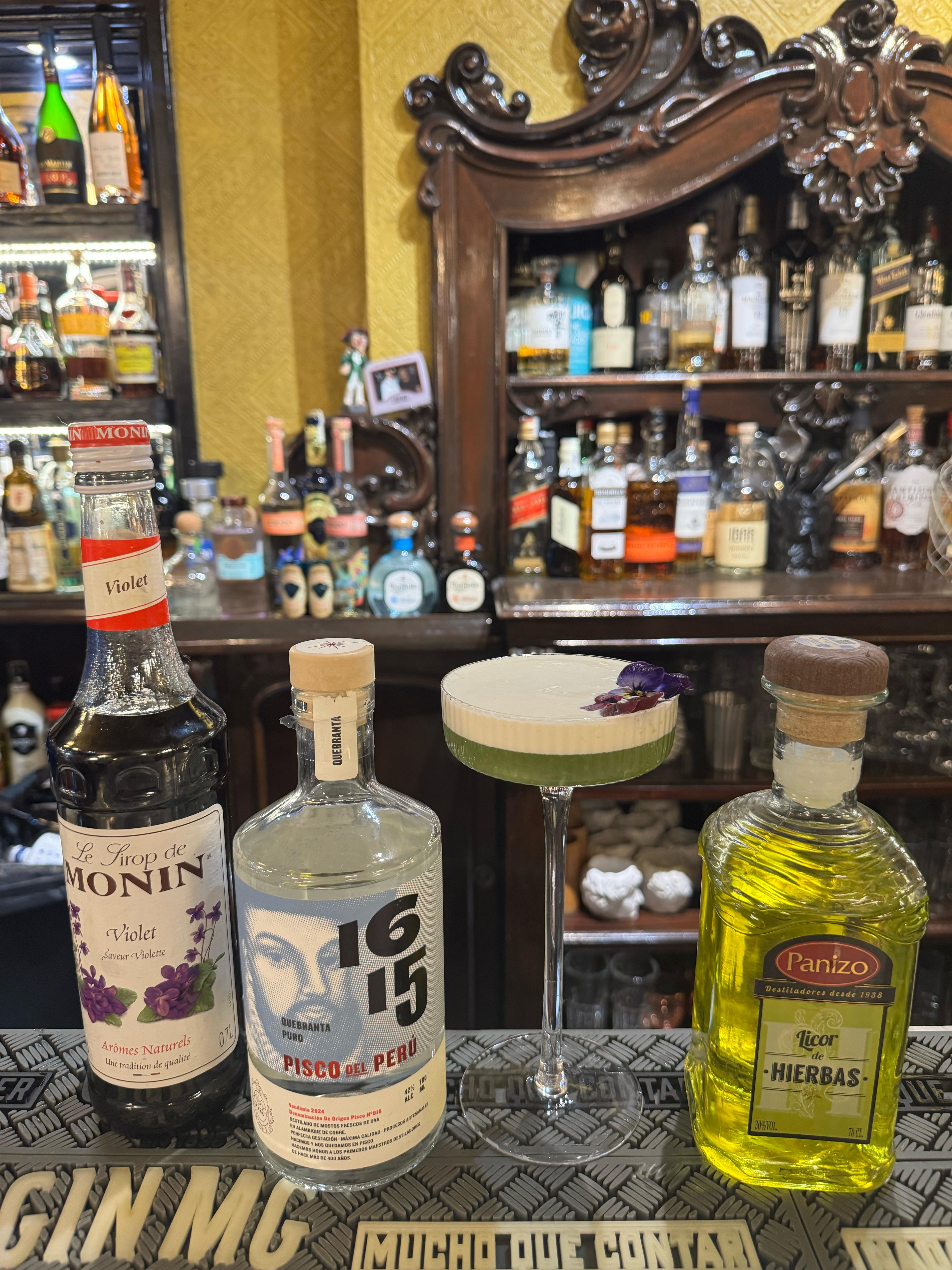 En la coctelera agregamos el Licor de Hhierbas Panizo, el zumo de limón, el pisco y la violeta
